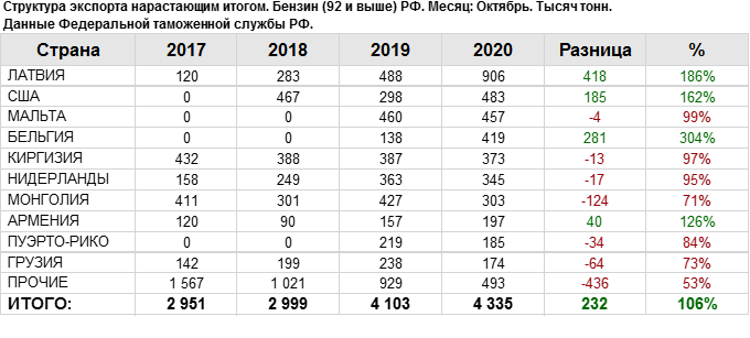 Объем поставок бензина (92 и выше) на экспорт за период с января 2020 года по октябрь 2020 года в Латвию составил 905.89 тыс. тонн, что на 444.04 тыс. тонн больше объема поставок в данную страну в 2019 году.