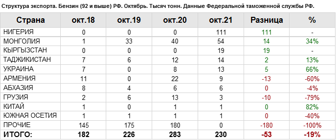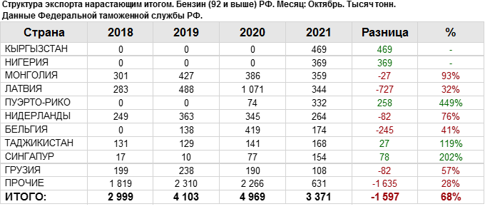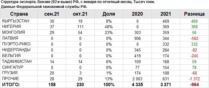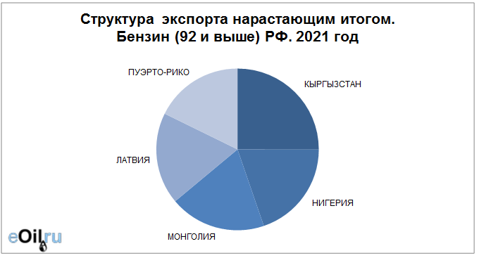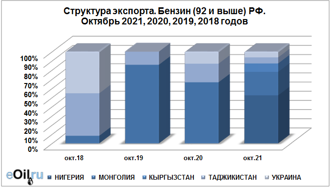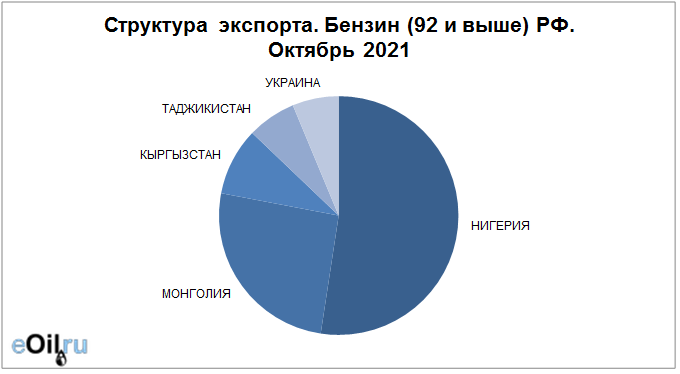 Структура экспорта бензина (92 и выше) из России с января 2021 по октябрь 2021