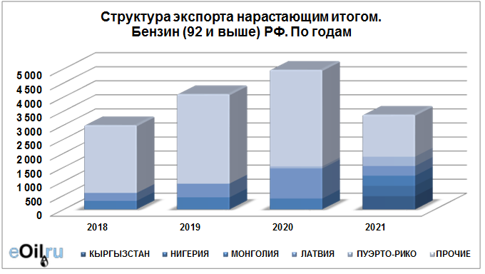 Структура экспорта бензина (92 и выше) из России нарастающим итогом по годам