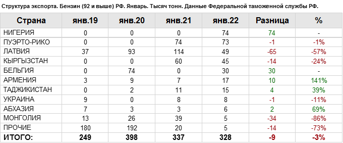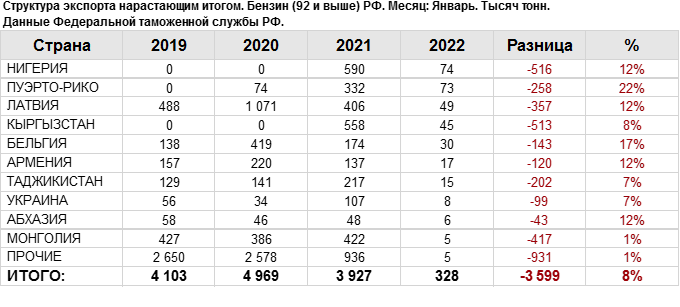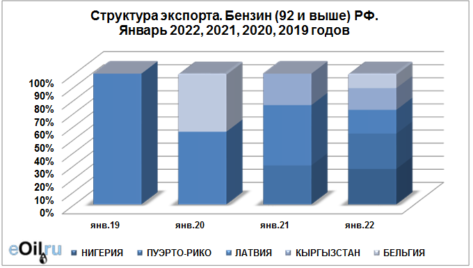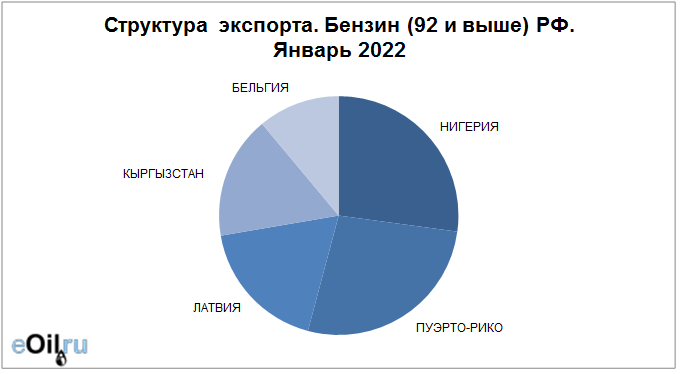 Структура экспорта бензина (92 и выше) из России за январь 2022