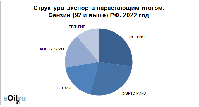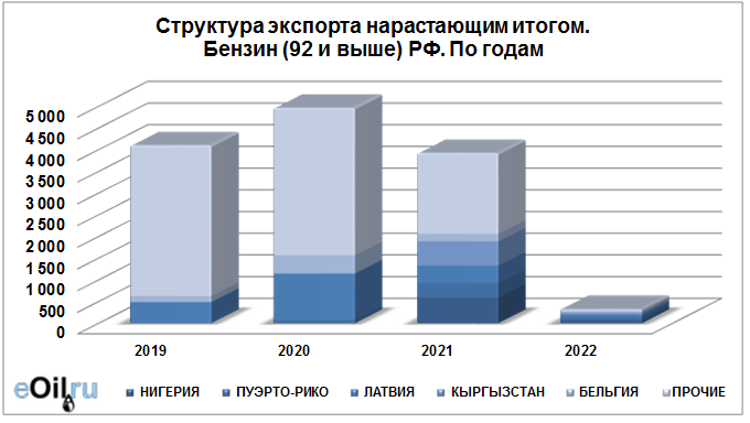 Структура экспорта бензина (92 и выше) из России нарастающим итогом по годам