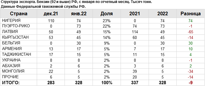 Наибольшие поставки осуществляются в Нигерию, объем 73.7 тыс. тонн. За прошлый 2021 год поставки в данную страну составляли 590.08 тыс. тонн.