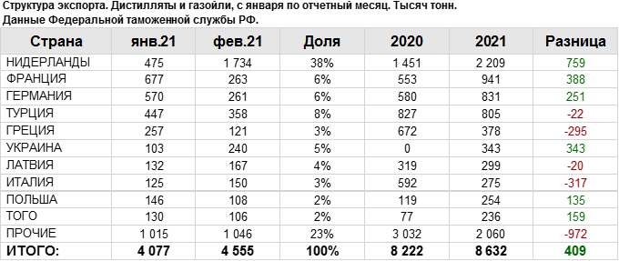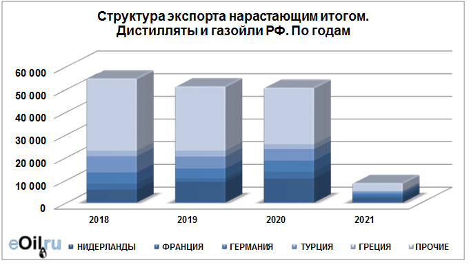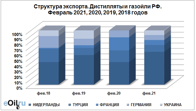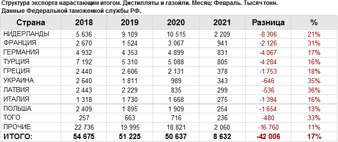 Росстат. Экспорт дистиллятов и газойлей из России на февраль 2021