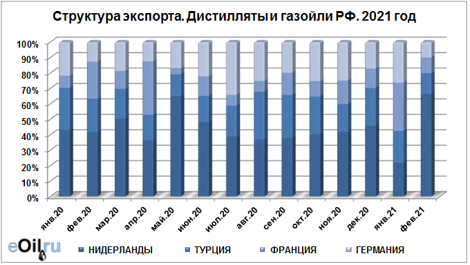 Структура экспорта дистиллятов и газойлей из России с января по февраль 2021
