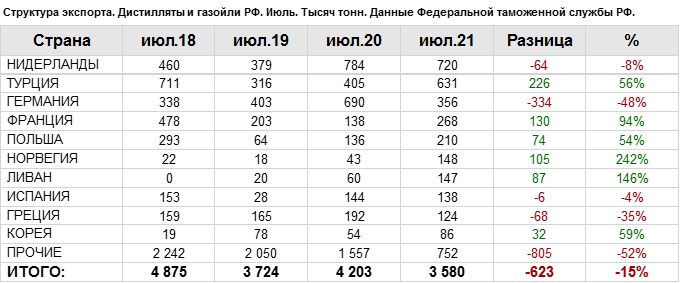 В июле 2021 года общий объем экспорта дистиллятов и газойлей составил: 3579.83 тыс. тонн.