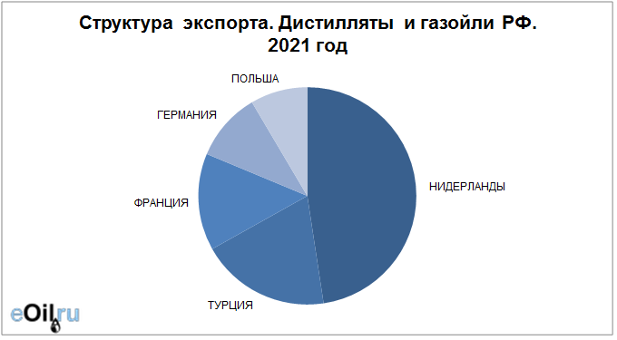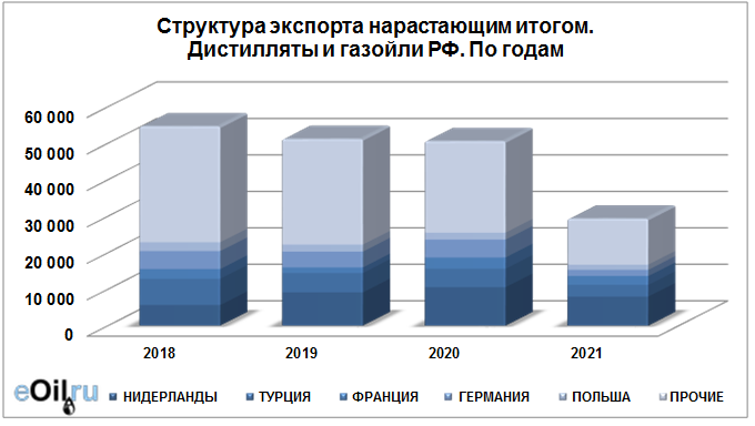 В 2021 году объем поставок дистиллятов и газойлей на экспорт достиг 29369.49 тыс. тонн. Данный объем на текущий момент составляет 58% от объема прошлого 2020 года.