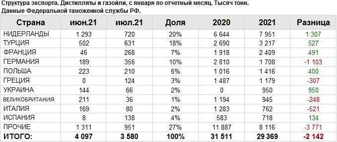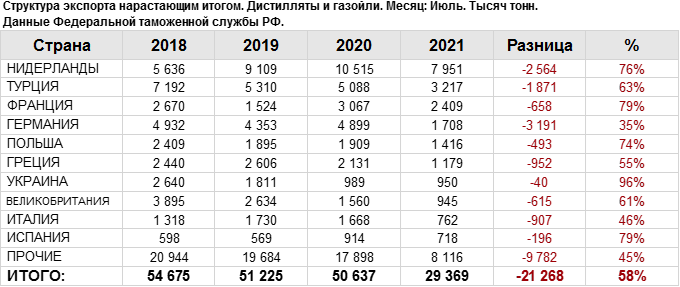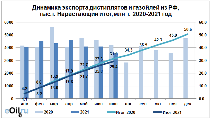 Росстат. Экспорт дистиллятов и газойлей из России на июль 2021