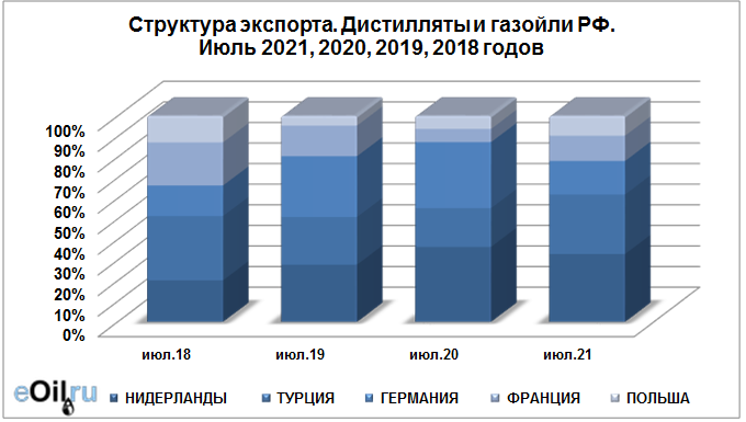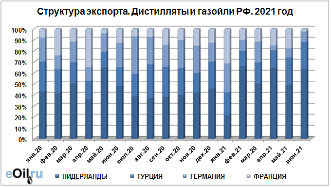Структура экспорта дистиллятов и газойлей из России с января 2021 по июль 2021