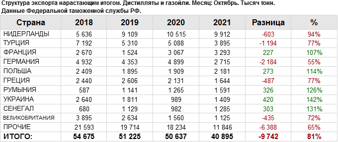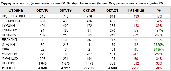 Росстат. Экспорт дистиллятов и газойлей из России на октябрь 2021