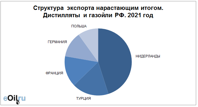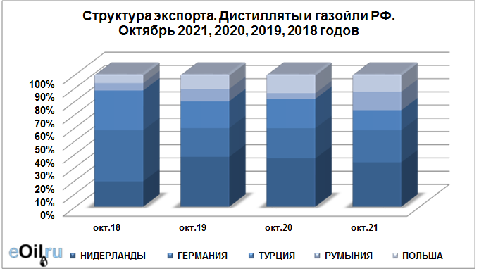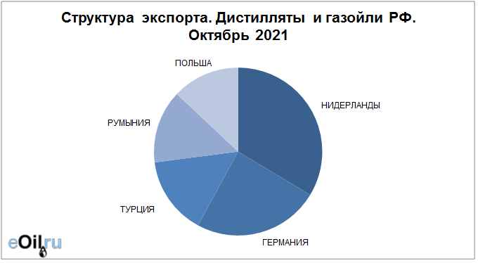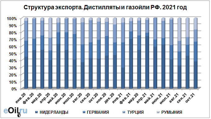 Структура экспорта дистиллятов и газойлей из России с января 2021 по октябрь 2021