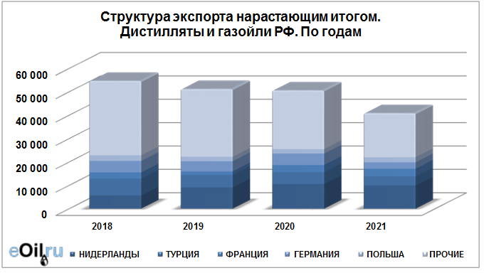 Структура экспорта дистиллятов и газойлей из России нарастающим итогом по годам