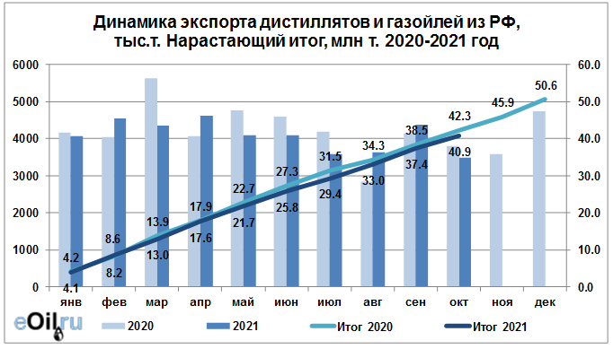 В 2021 году объем поставок дистиллятов и газойлей на экспорт достиг 40895.02 тыс. тонн. Данный объем на текущий момент составляет 81% от объема прошлого 2020 года.