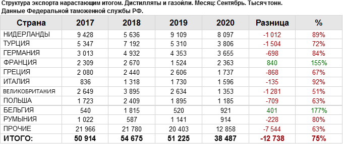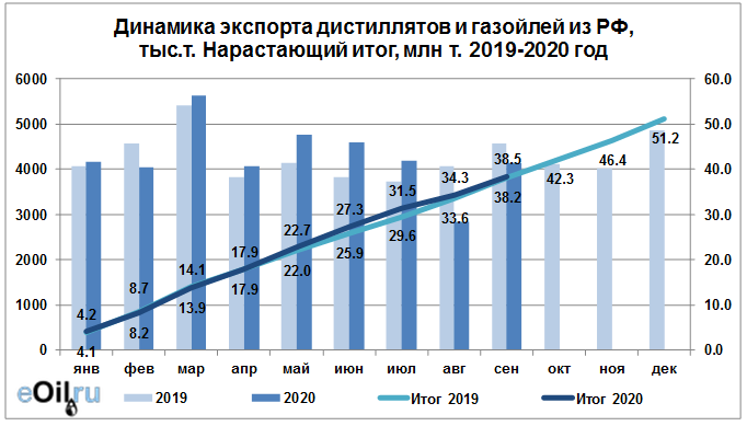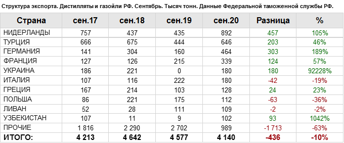 Росстат. Экспорт дистиллятов и газойлей из России на сентябрь 2020