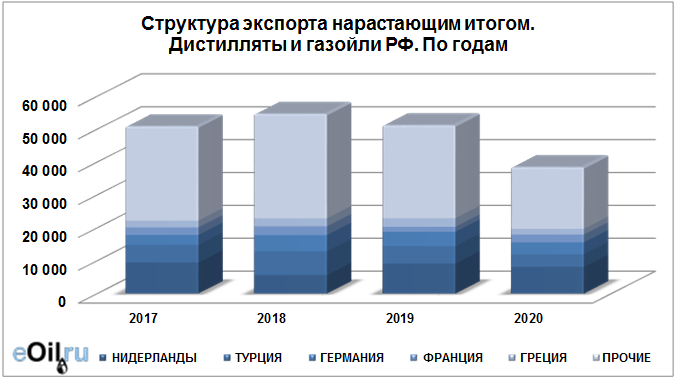 Структура экспорта дистиллятов и газойлей из России нарастающим итогом по годам