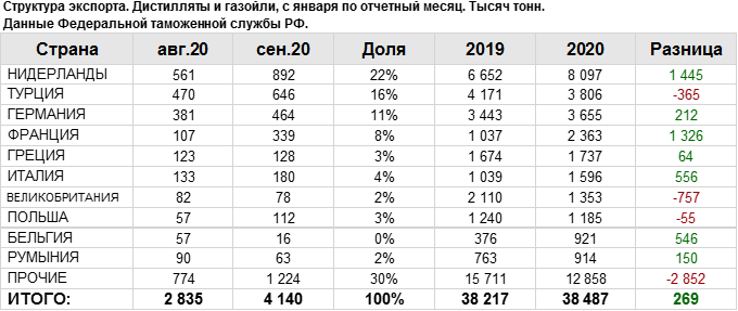 В сентябре 2020 года общий объем экспорта дистиллятов и газойлей составил: 4140.39 тыс. тонн.