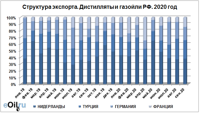 Структура экспорта дистиллятов и газойлей из России с января по сентябрь 2020