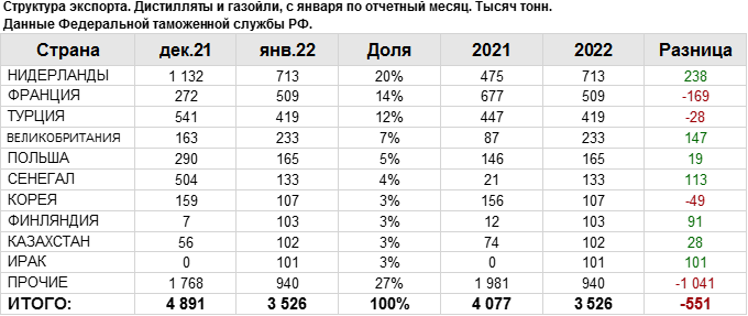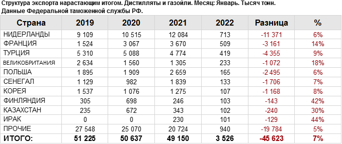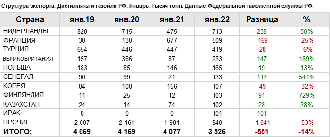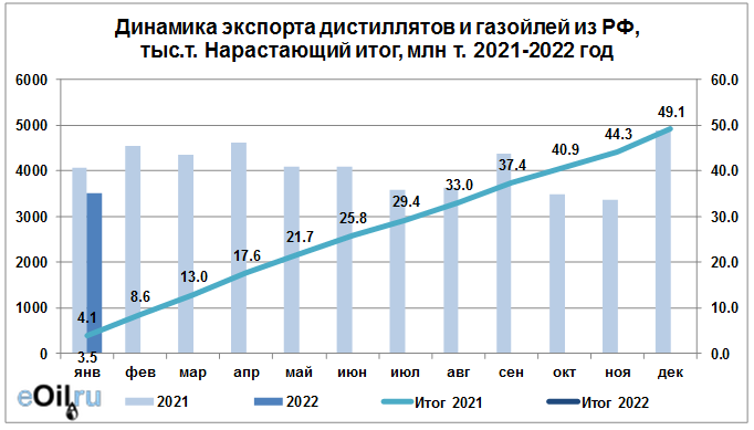 Росстат. Экспорт дистиллятов и газойлей из России на январь 2022