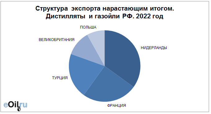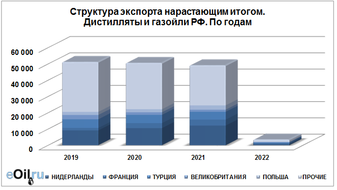 Структура экспорта дистиллятов и газойлей из России нарастающим итогом по годам