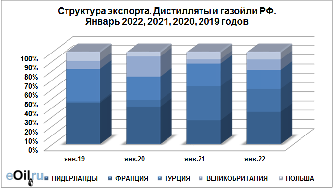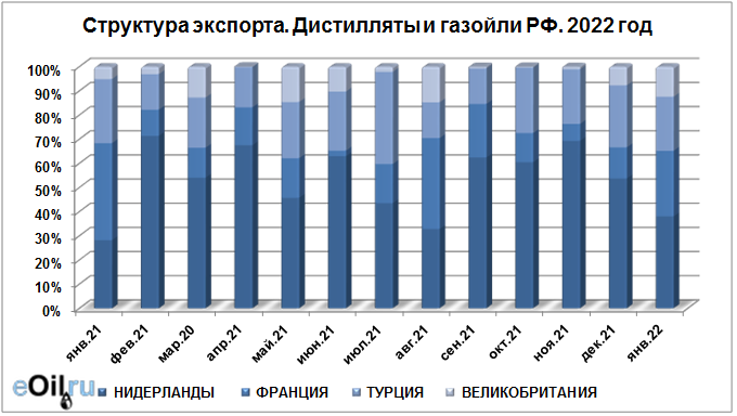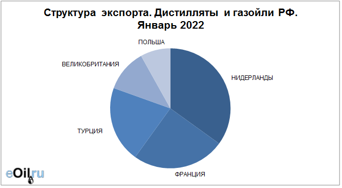 Структура экспорта дистиллятов и газойлей из России за январь 2022