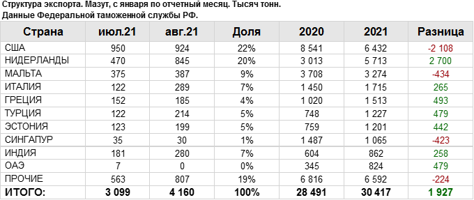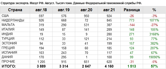 В августе 2021 года общий объем экспорта мазута составил: 4159.55 тыс. тонн.