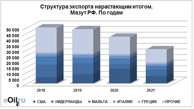 Структура экспорта мазута из России нарастающим итогом по годам