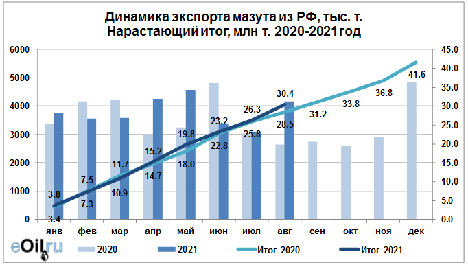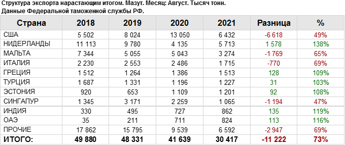 Росстат. Экспорт мазута из России на август 2021