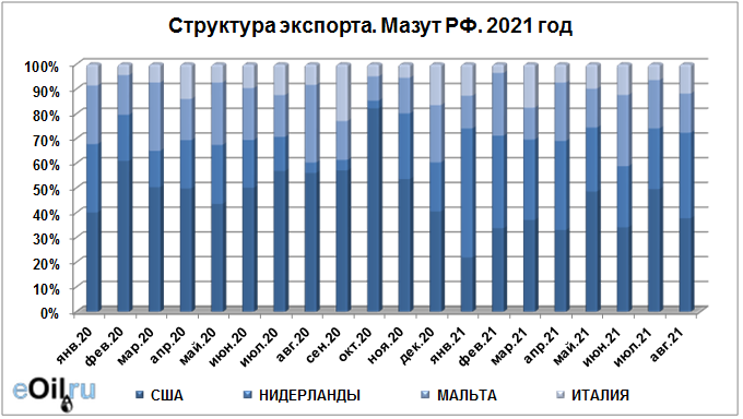 Структура экспорта мазута из России с января по август 2021