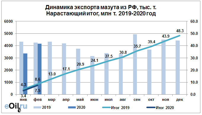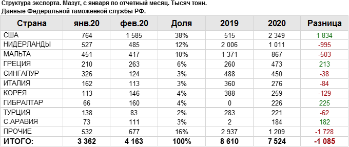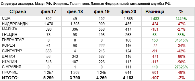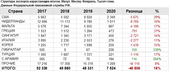Росстат. Экспорт мазута из России на февраль 2020