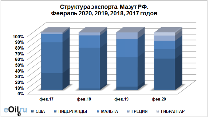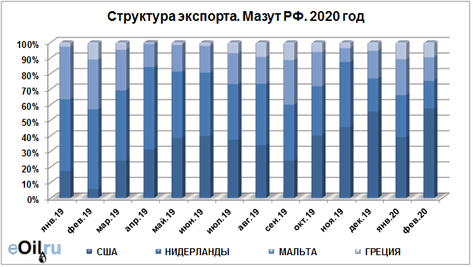Структура экспорта мазута из России с января по февраль 2020