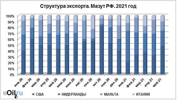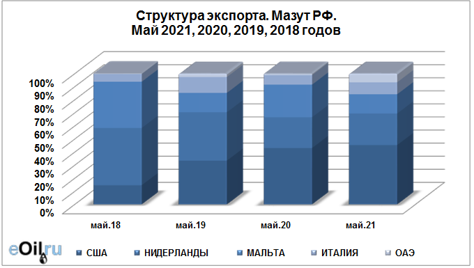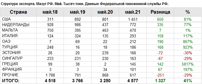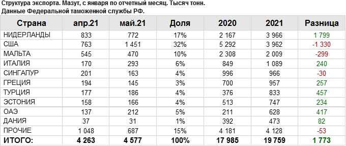 В мае 2021 года общий объем экспорта мазута составил: 4576.94 тыс. тонн.