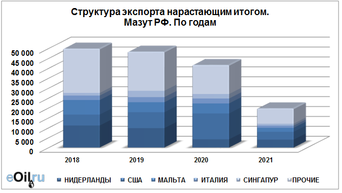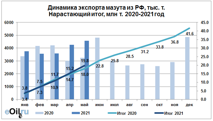 В 2021 году объем поставок мазута на экспорт достиг 19758.65 тыс. тонн. Данный объем на текущий момент составляет 47% от объема прошлого 2020 года.