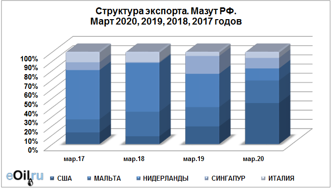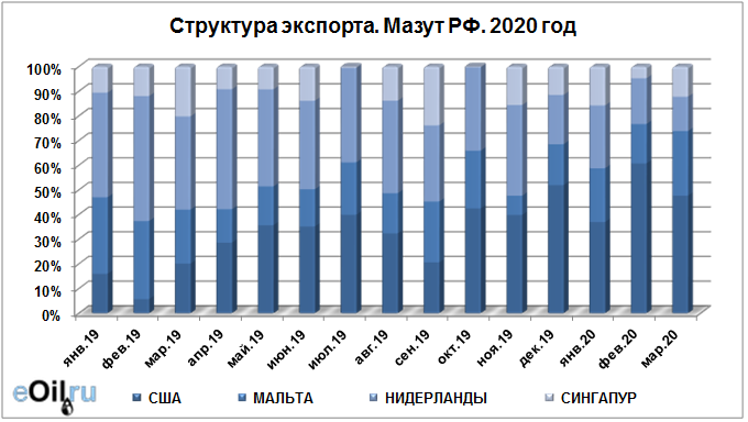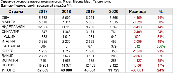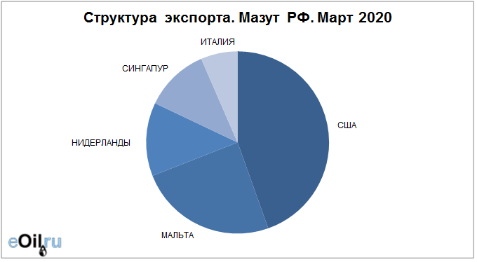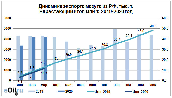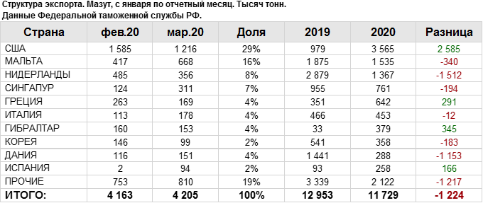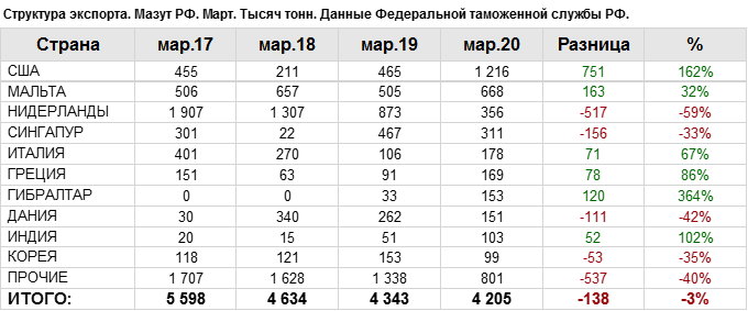 В марте 2020 года общий объем экспорта мазута составил: 4204.71 тыс. тонн.