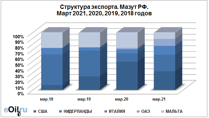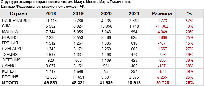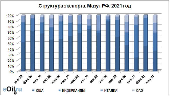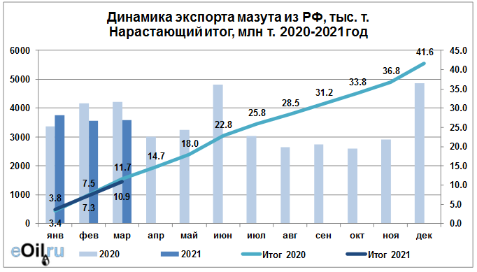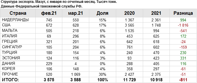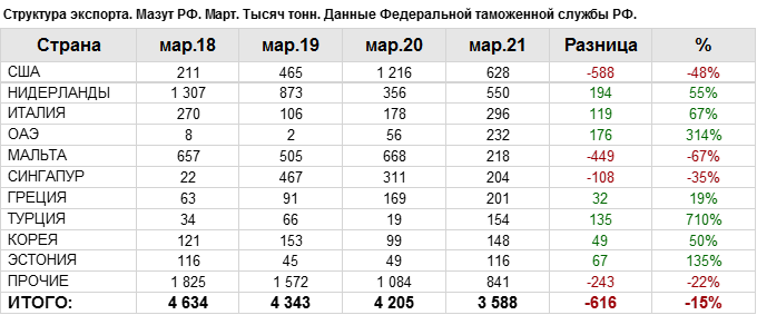 В март 2021 года общий объем экспорта мазута составил: 3588.28 тыс. тонн.