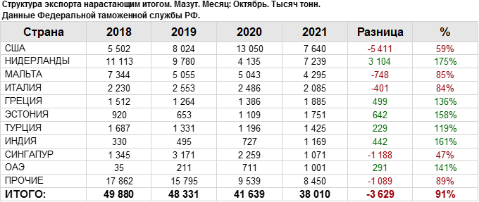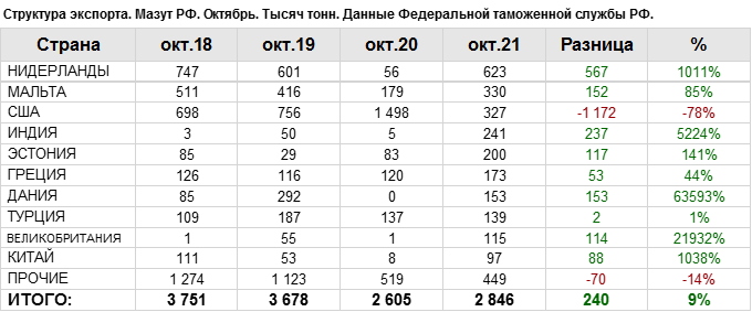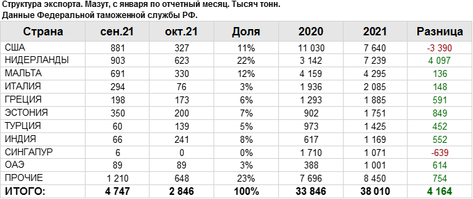 Росстат. Экспорт мазута из России на октябрь 2021