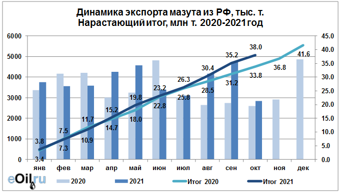 В 2021 году объем поставок мазута на экспорт достиг 38010.21 тыс. тонн. Данный объем на текущий момент составляет 91% от объема прошлого 2020 года.