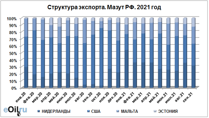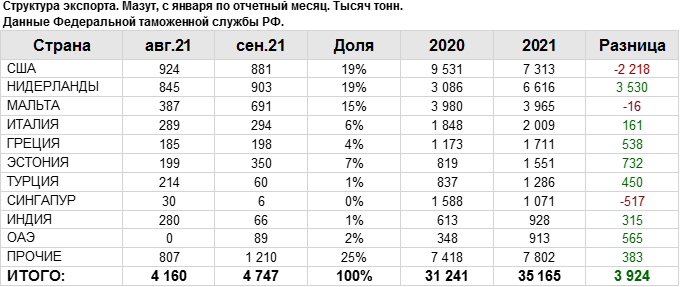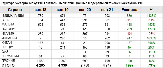 В сентябре 2021 года общий объем экспорта мазута составил: 4747.46 тыс. тонн.