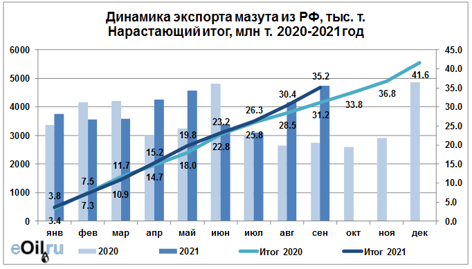 В 2021 году объем поставок мазута на экспорт достиг 35164.61 тыс. тонн. Данный объем на текущий момент составляет 84% от объема прошлого 2020 года.