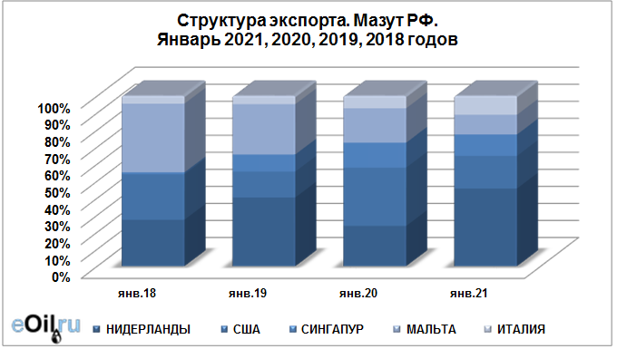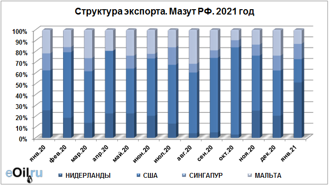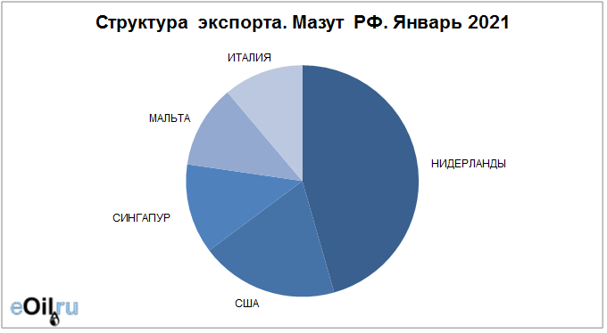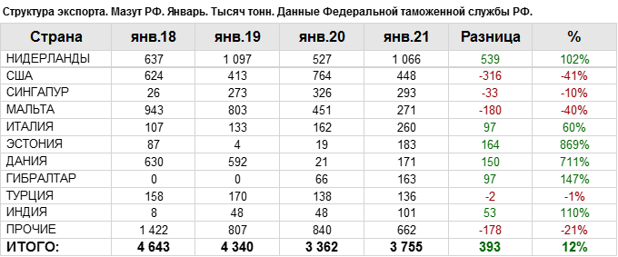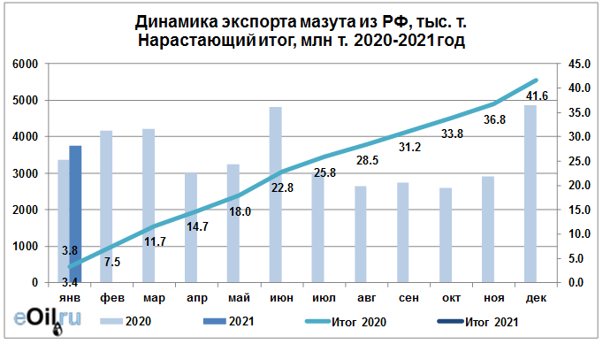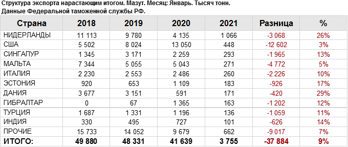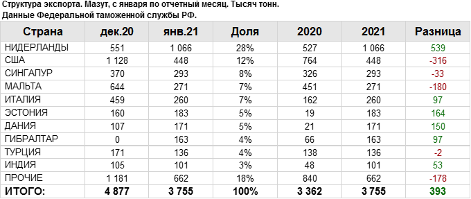 В январе 2021 года общий объем экспорта мазута составил: 3755.02 тыс. тонн.