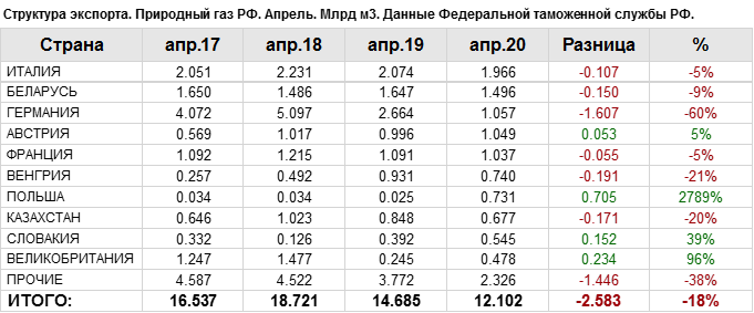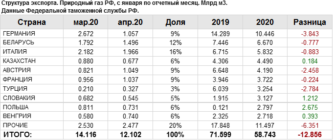 В апреле 2020 года общий объем экспорта природного газа составил: 12.1 млрд. куб. м.