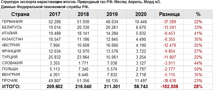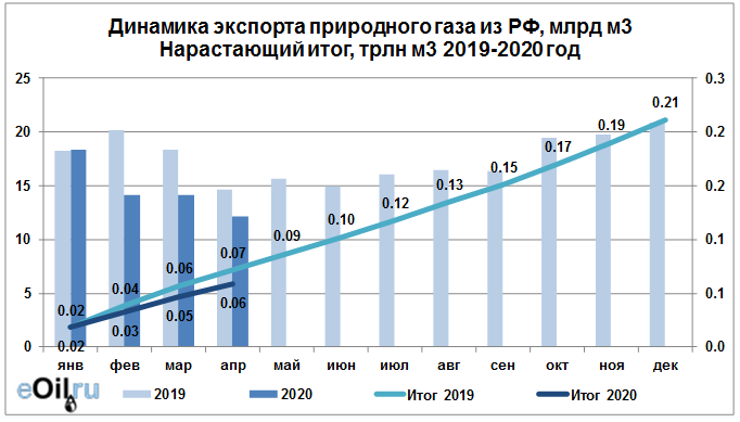 Росстат. Экспорт природного газа из России на апрель 2020