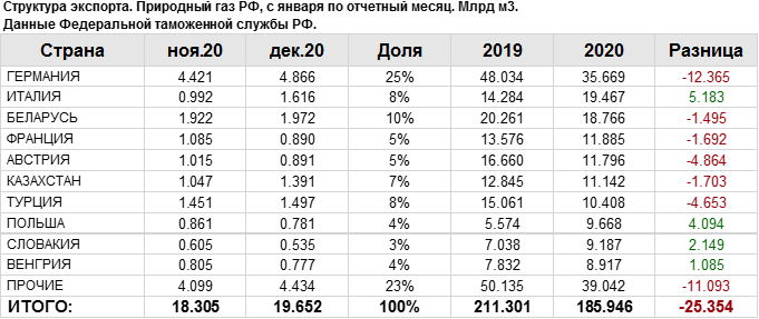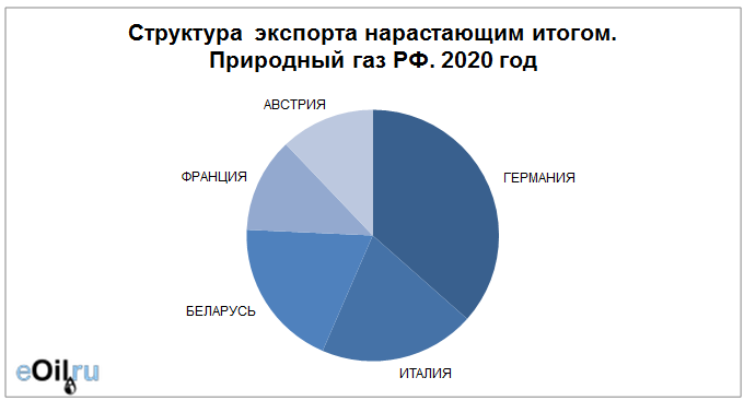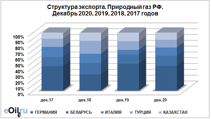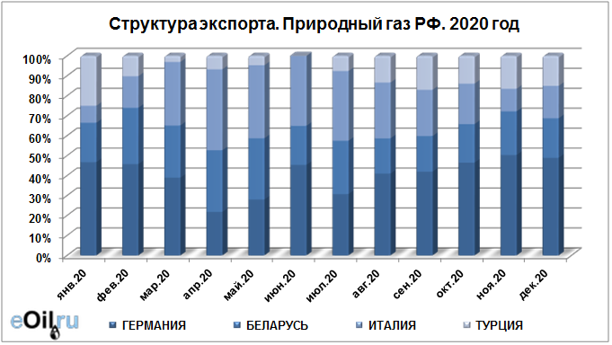 Структура экспорта природного газа из России с января 2020 по декабрь 2020