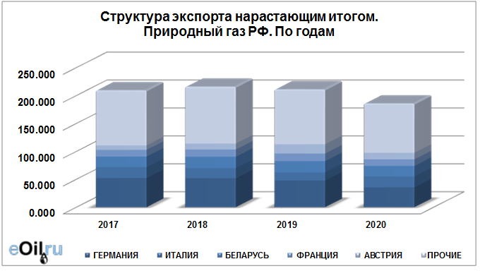 Структура экспорта природного газа из России нарастающим итогом по годам