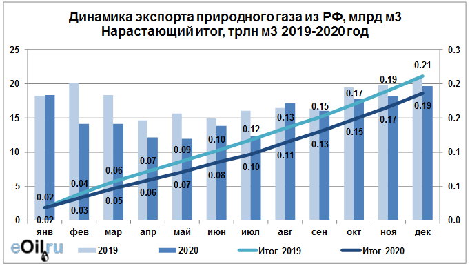 В декабре 2020 года общий объем экспорта природного газа составил: 19.65 млрд. куб. м.