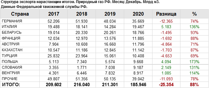Росстат. Экспорт природного газа из России на декабрь 2020