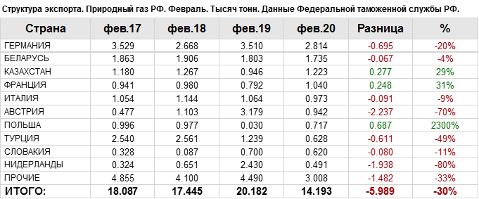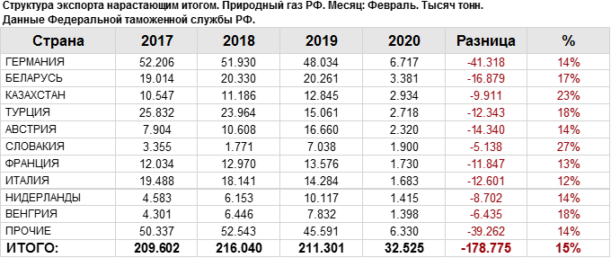 Росстат. Экспорт природного газа из России на февраль 2020
