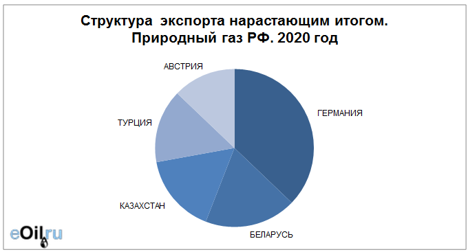 Наибольшие поставки осуществляются в Германию, объем 6.72 млрд. куб. м. За прошлый 2019 год поставки в данную страну составляли 48.03 млрд. куб. м.