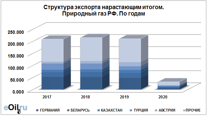 Структура экспорта природного газа из России нарастающим итогом по годам