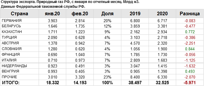В феврале 2020 года общий объем экспорта природного газа составил: 14.19 млрд. куб. м.