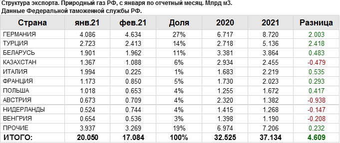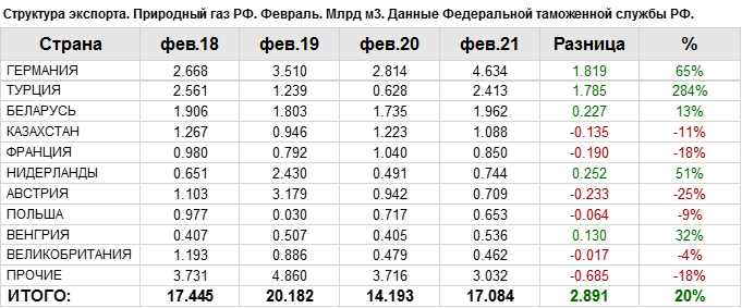 В феврале 2021 года общий объем экспорта природного газа составил: 17.08 млрд. куб. м.