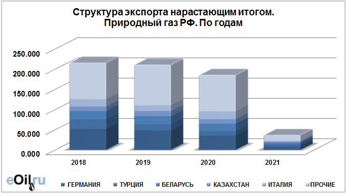 Структура экспорта природного газа из России нарастающим итогом по годам